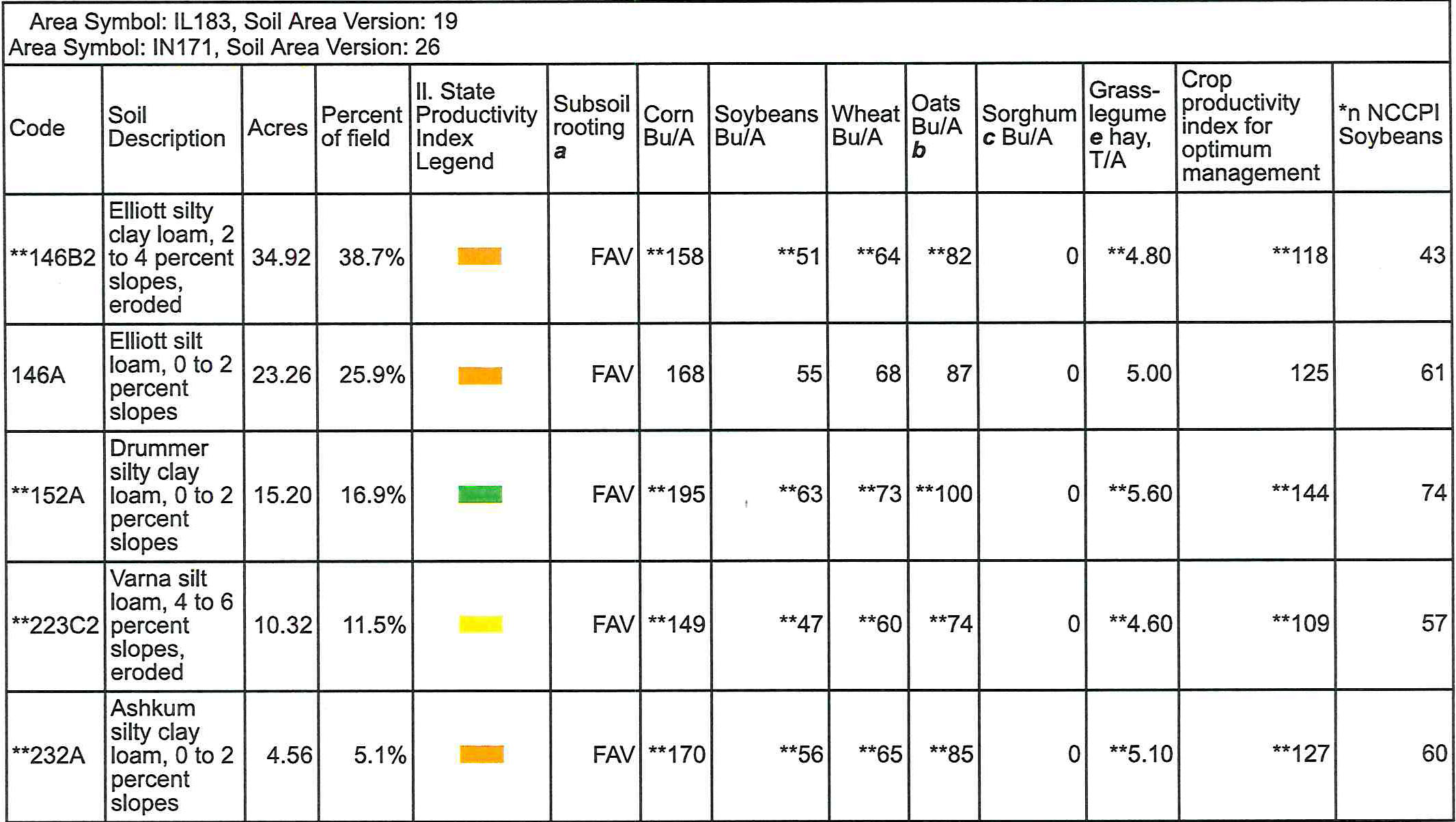 - Primary soils: Elliott Silty Clay loam, Elliott Silt loam,
